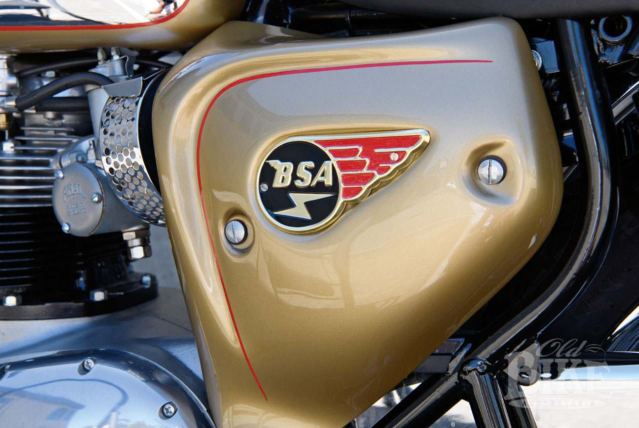Out went the standard dual seat, to be replaced with a racing-style humped back single seat with a big red BSA badge inset on the rear. In keeping with its intended purpose, handlebars were of the ‘Ace’ style – forward and low set – with rear set footrests and gear lever/rear brake pedal to match. In the case of the rear brake, a complex dual-rod linkage was used, apparently purely to permit the stop light switch to remain in the standard position. The kick start lever was cranked out to clear the muffler, and because the gear lever faced backwards rather than forwards, the internal selector mechanism in the close-ratio gearbox was reversed to retain BSA’s usual down-for-first gear change pattern. As on the A65R, the exhaust system itself was of the ‘Siamesed’ variety, with the left side engine pipe cranked across the frame front down tubes to join the right. The muffler was unique to the model, with the front pick up point for the engine pipe set at the bottom as seen on some Triumphs. Curiously, in view of its race track intentions, the front brake was the Gold Star type single sided, single leading shoe type rather than a twin-leading shoe job, however the US model was catalogued with a 190mm full width single-leading-shoe drum.