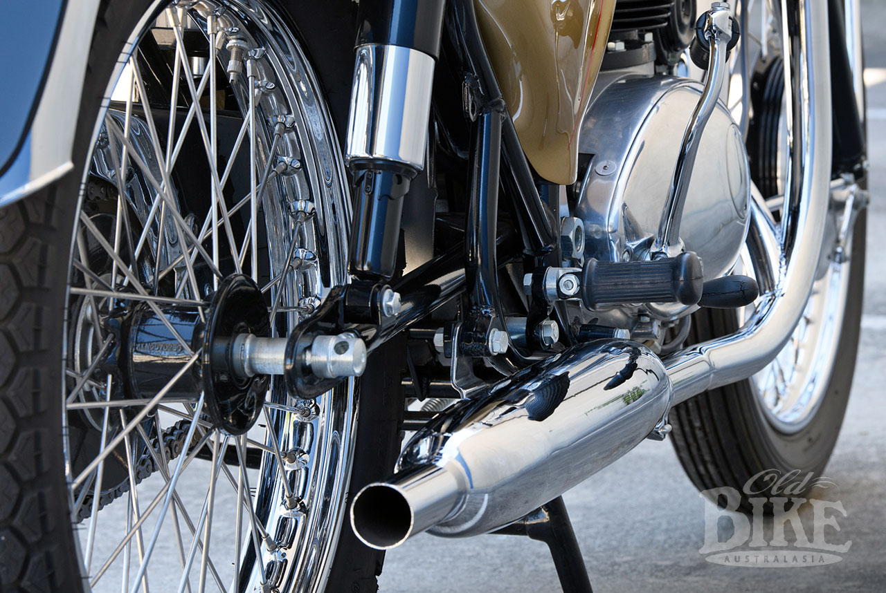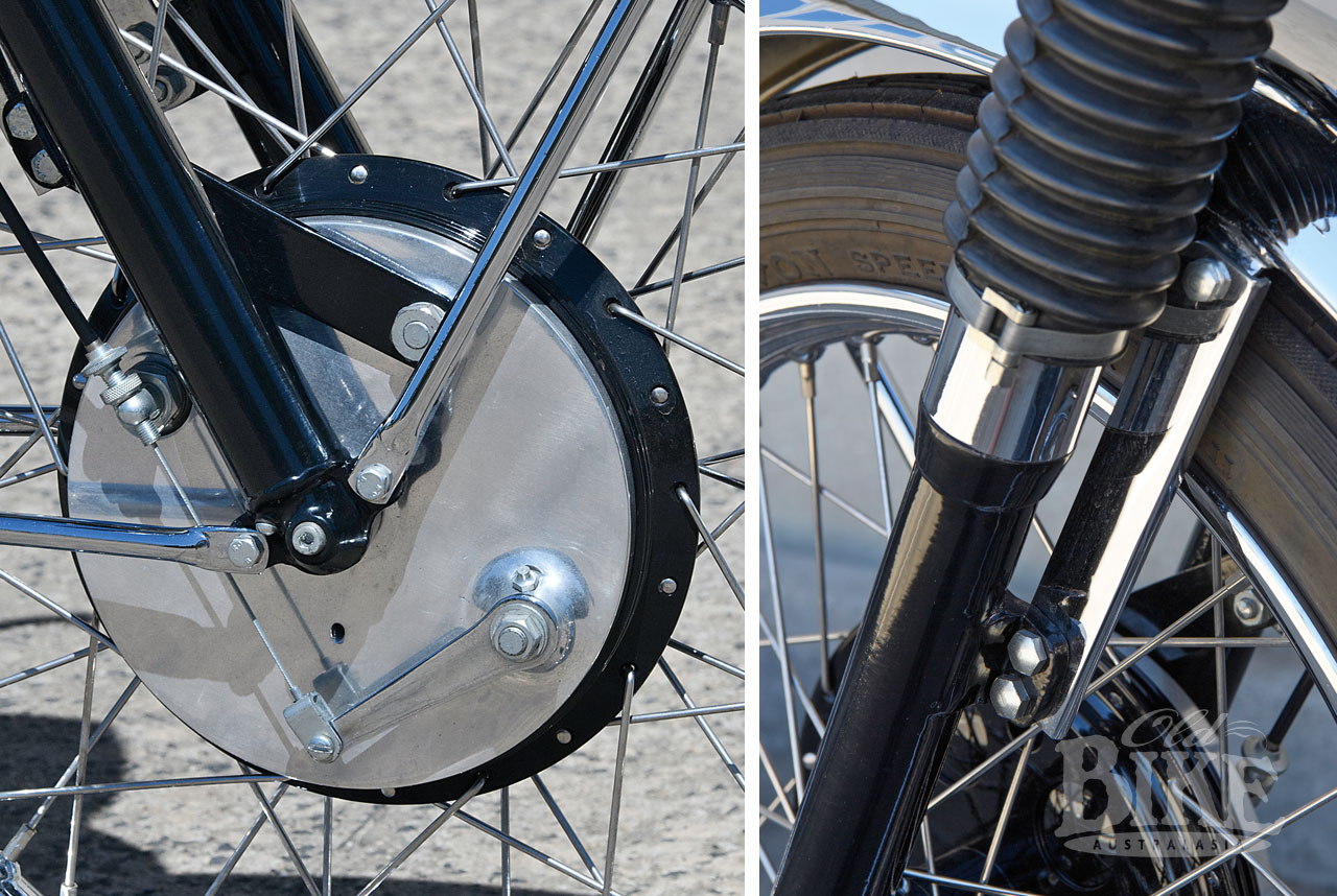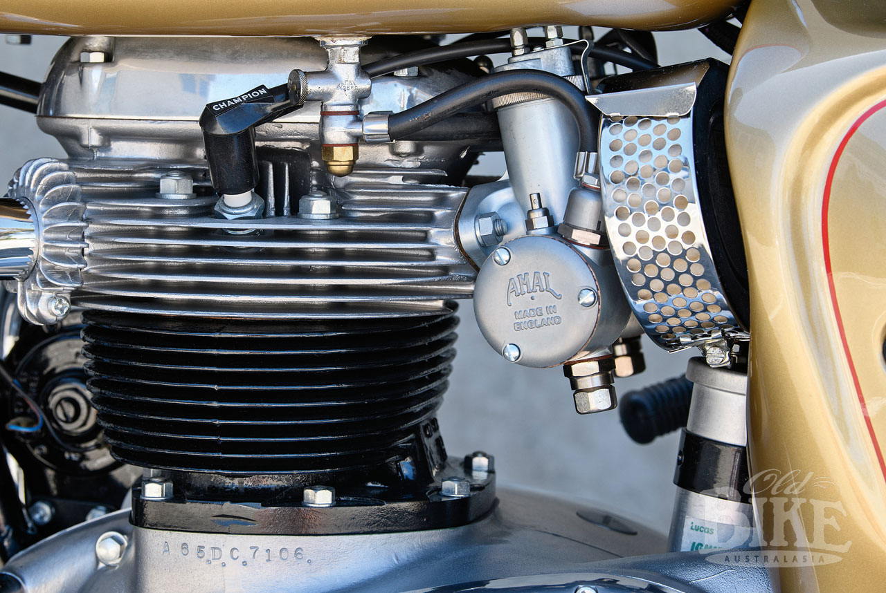 Our featured motorcycle is supplied by Jon Munn from Classic Style Motorcycles at Seaford, Victoria, and was imported from USA in a rather sorry state. It certainly does not look sorry now, after a ground-up restoration by Jon and his former workshop manager Geoff Knott, now retired. Jon points out touches that make the Lightning Clubman unique, such as the Gold Star-style badge set into the rear of the seat hump, and the complex rear brake rod system. Resplendent in a gold/chrome/red décor, the machine really stands out in a crowd, and there is invariably one around it whenever it appears.