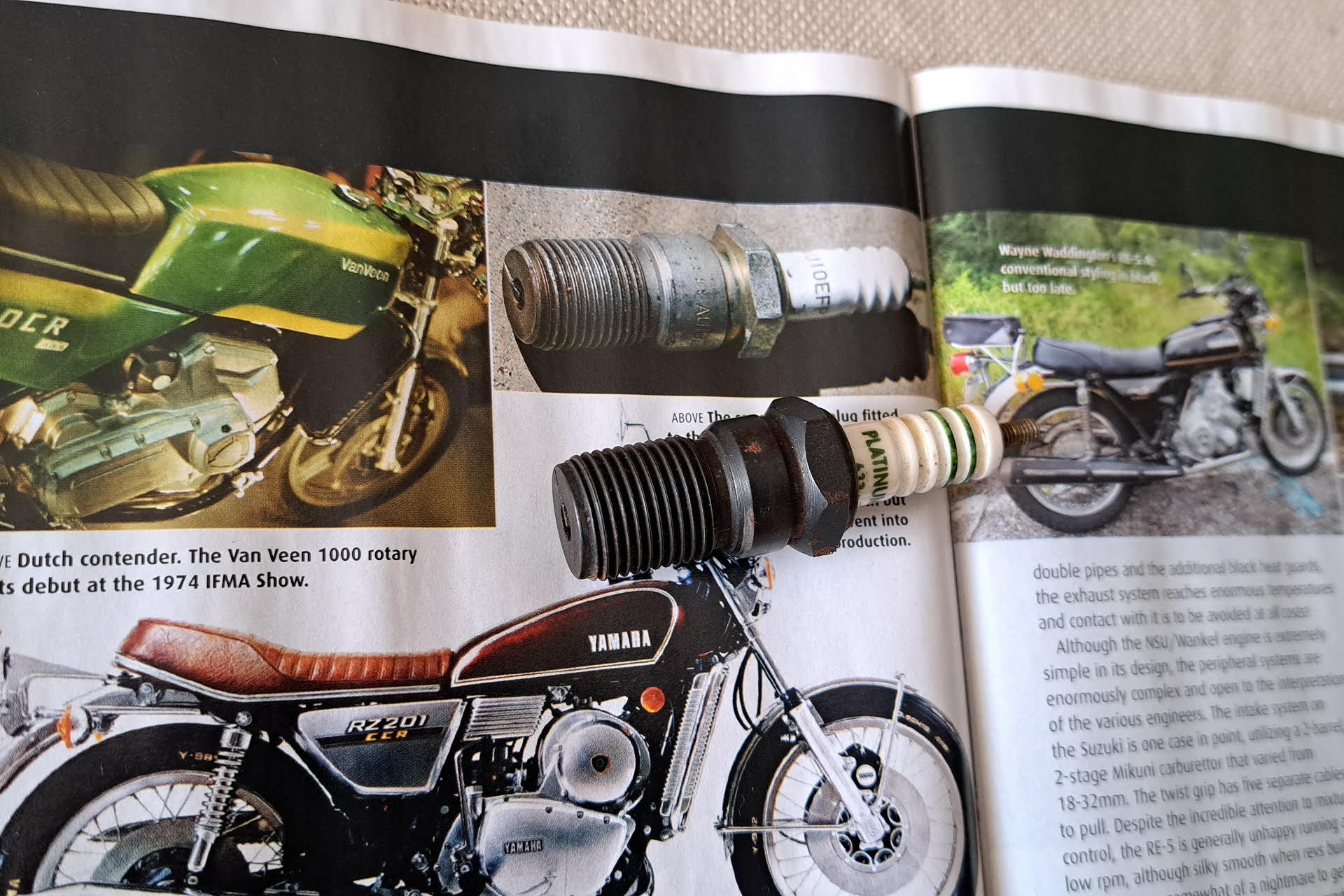 My friend and I were sharing and enjoying the latest issue of Old Bike Australasia (#125) over a coffee. The article about Suzuki’s rotary prompted us to reminisce, as my friend has been known as ‘Rotary Leigh’ since owning two of these beasts in the 70s. He then told me that he is perhaps the only person to have raced one. Apparently they were a bit of a handful around Phillip Island given the gyroscopic effect of the heavy central rotor. As if to prove such an unlikely tale, Leigh managed to find his racing spark plug. I wonder how many of these have survived.