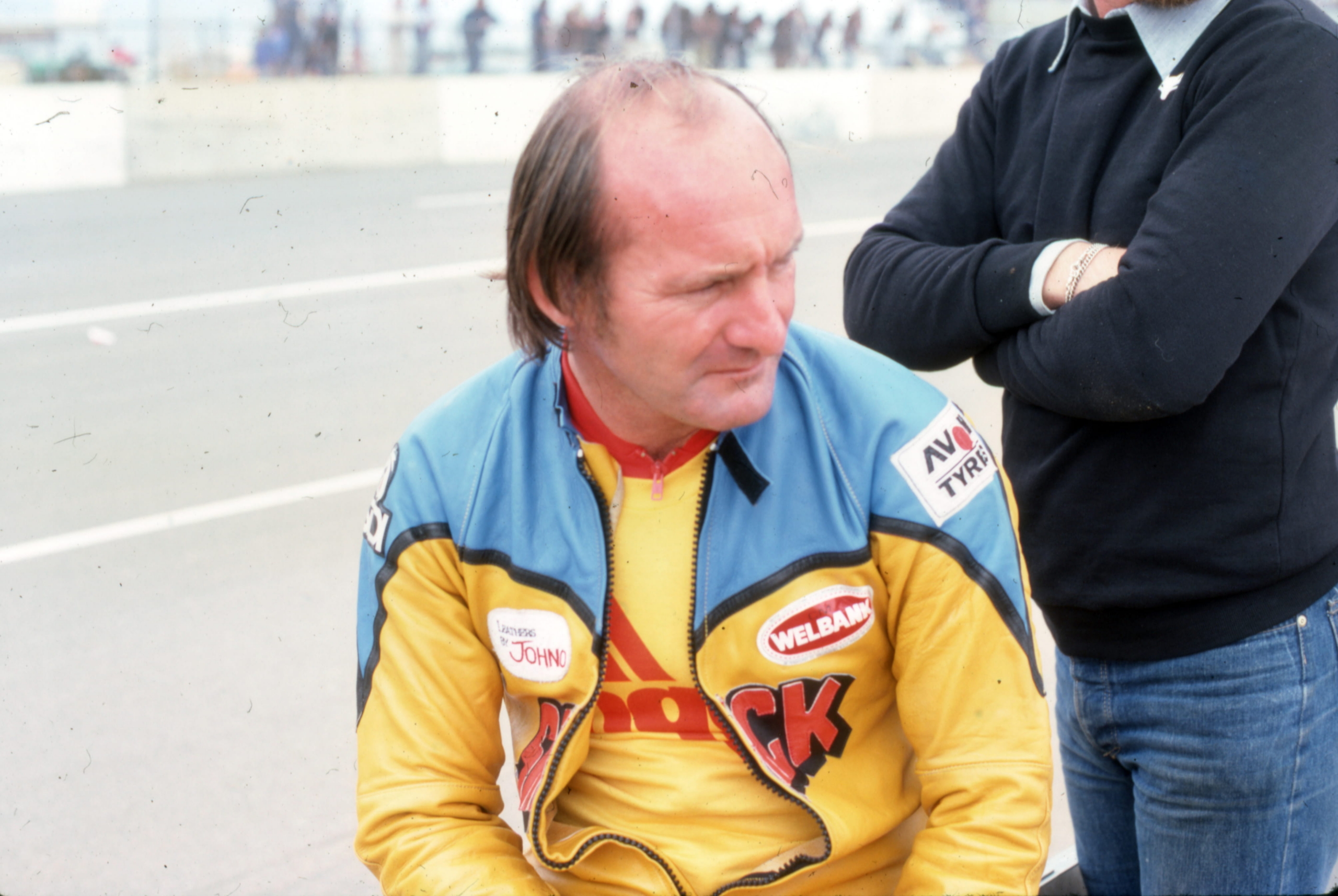 Ed: The TZ500 Yamaha Dave Myall refers to, in the Isle of Man pits in 1980. Mike Hailwood, who entered the bike through his Hailwood & Gould Yamaha dealership in Birmingham, looks on as Peter Addison (blue overalls) gets the bike ready for Jim to take out in the Senior TT.