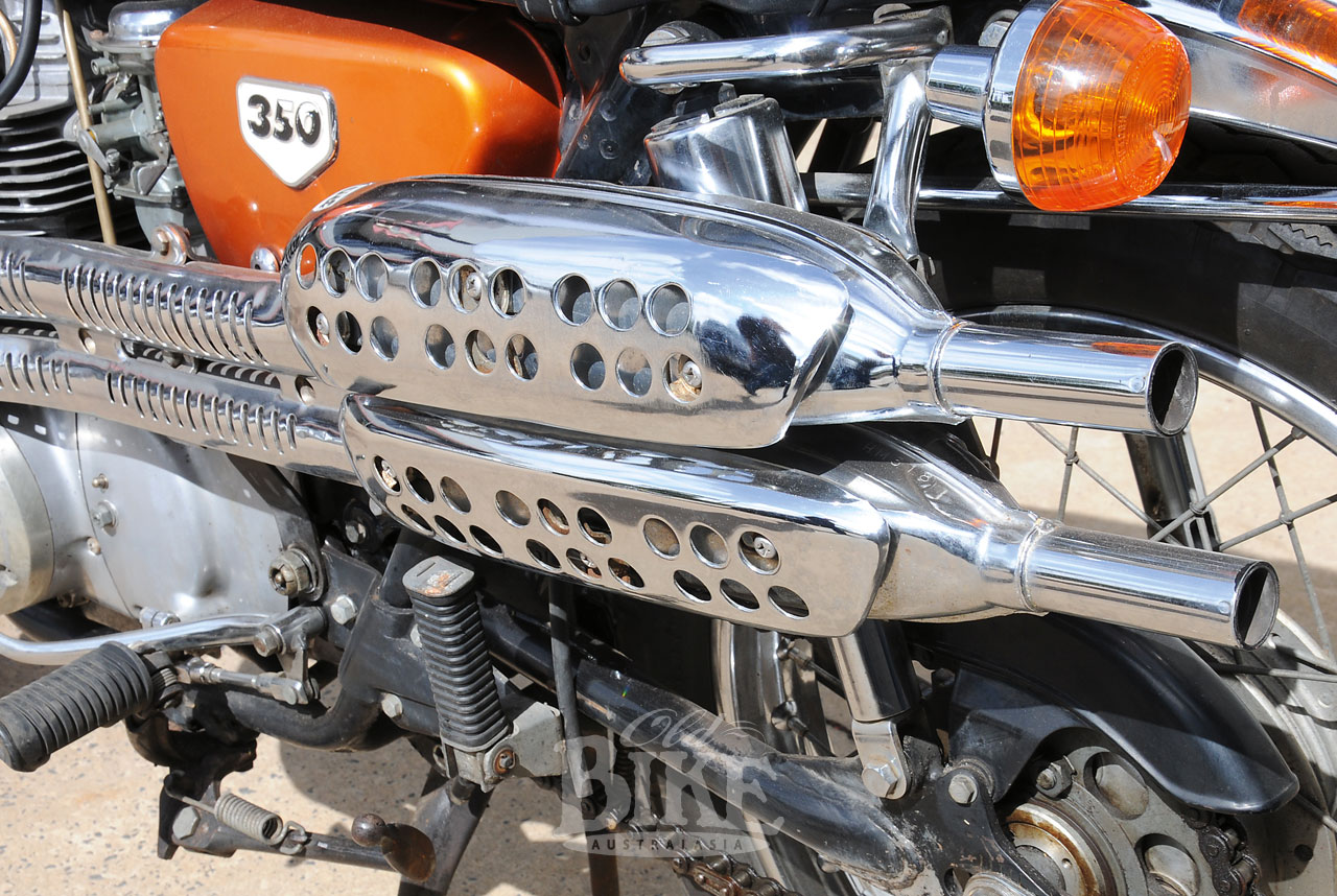 The CB used a conventional pair of down-swept pipes with long tapering megaphone silencers, whereas the CL employed an upswept system on the left side, with small diameter internal engine pipes fitted inside larger diameter outer pipes, finishing in a bulky, heavy and probably more restrictive box-like silencer which emitted a quite unique exhaust note. The reason for the sheathed engine pipes was two-fold. On one hand, having an external pipe reduced discolouration, and being fatter, looked tougher, but more practically, the actual exhaust pipe (the inner one) operated with greater efficiency (higher gas velocity) because of its reduced diameter. Smart. The CL’s complete exhaust system added 10.5kg to the overall weight.