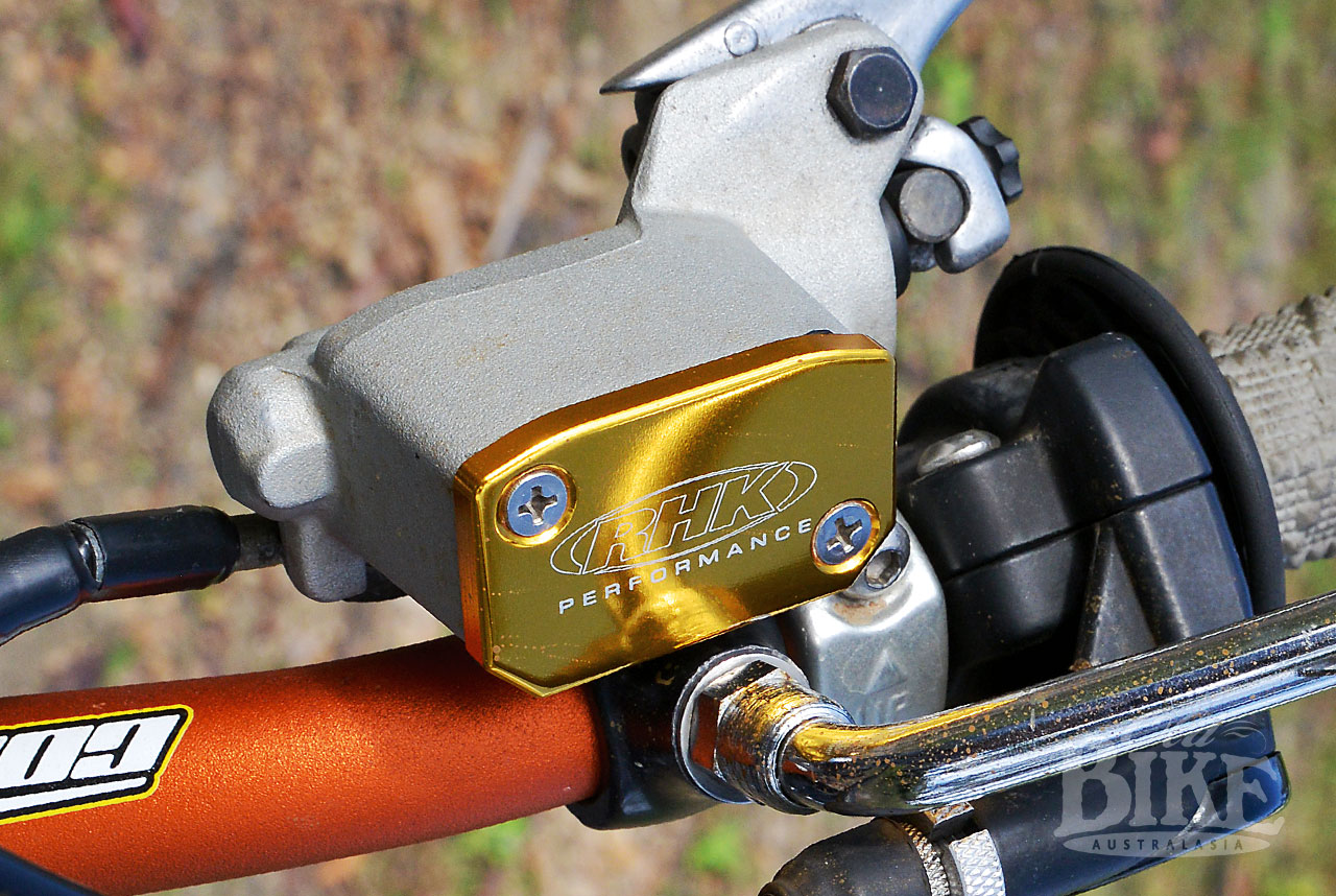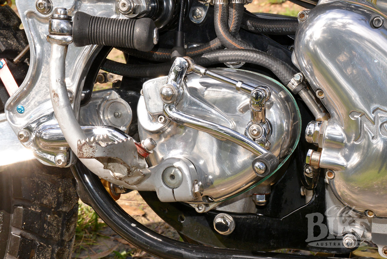 While John took medical advice and eased the pace of life a little, it gave him time to consider the best way to rebuild the wreck, which he describes as a “write-off”. “It had the XT600 front end at that stage so I had to completely dismantle it and straighten the frame again – the steering head was twisted so the front wheel wasn’t in line with the back. This time the KTM front end went in with the Öhlins rear shocks, with a Honda bash plate that actually went straight on after I welded on a couple of braces. I also made a new gear change set up to move it further back, with Husqvarna footrests. The gear change now pivots off the gearbox inspection cap with a bit welded on it. I kept the Commando alloy plates but cut off the extension for the pillion footrests and muffler mounts, you don’t need them, but I’ve always liked that aluminium piece. The speedo and tacho are Yamaha and the blinkers are just little driving lights. The front brake master cylinder is from a KTM. I had a hydraulic clutch on it but it let me down and I thought if I’m in the bush and it fails I’m in trouble, but I can carry spare cables so it came off and just a normal clutch cable went on.