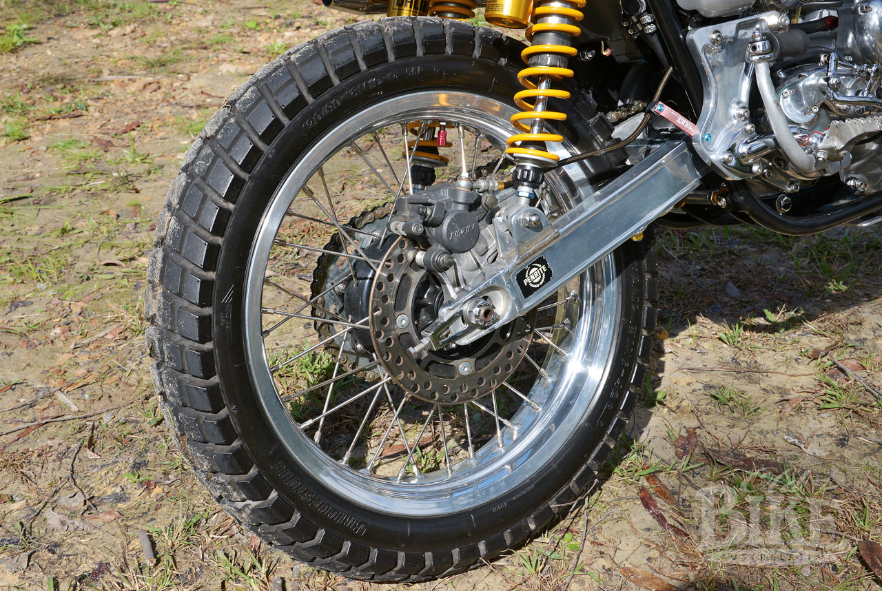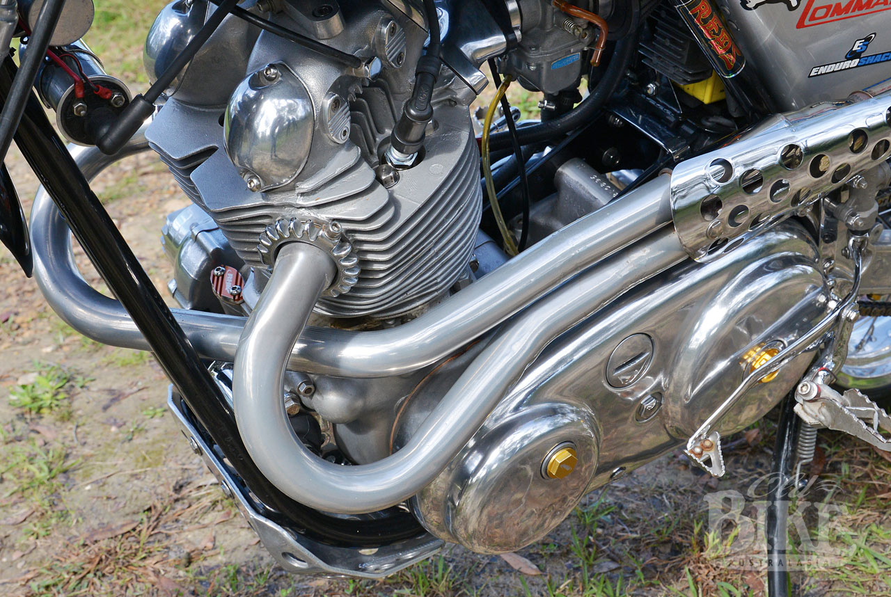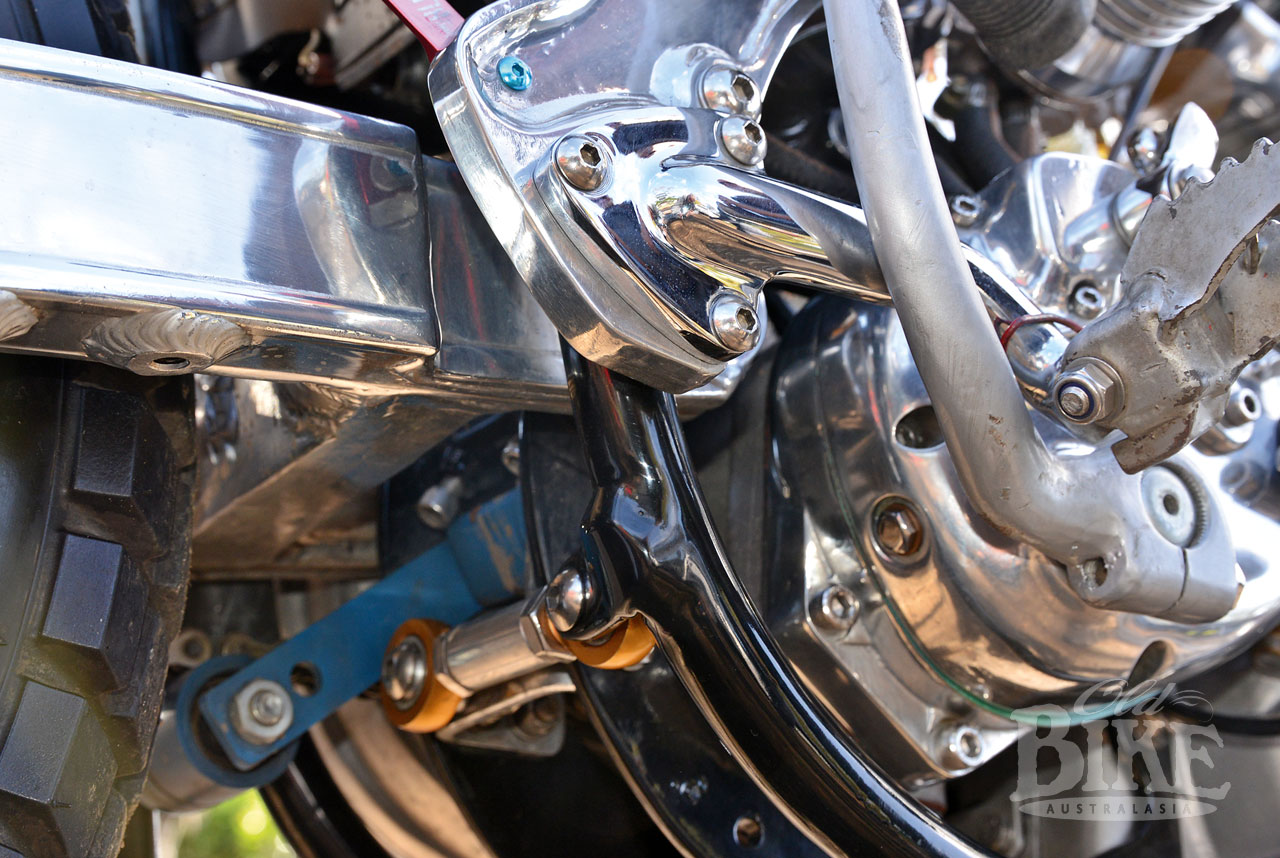 “The oil tank has been stretched. I cut it apart and added a section so it would hold more oil. If you’re riding long distances they get too hot, so more oil cools the motor down and they last longer. I’ve also put an oil cooler and filter just above the gearbox.