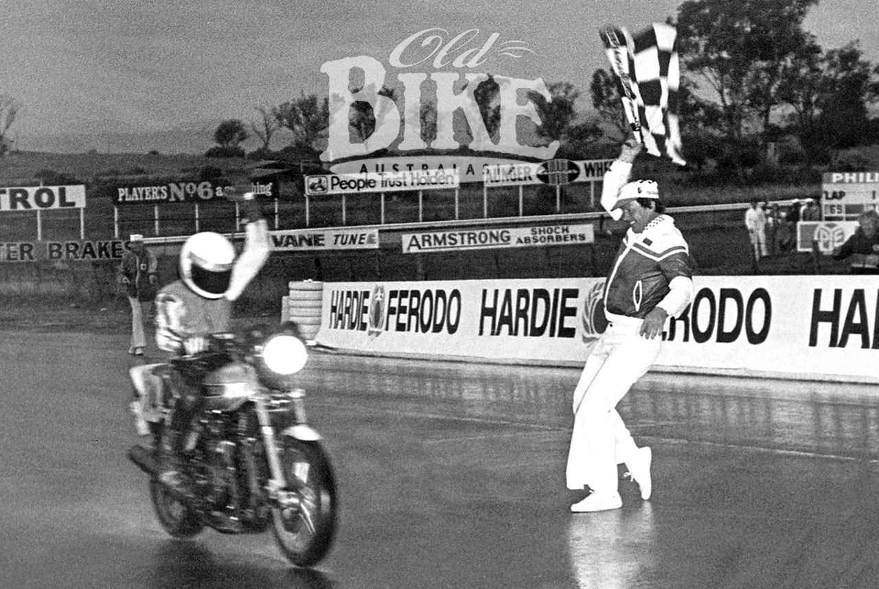 Tony Hatton takes the flag to win the Arai 3 Hour in 1979.
